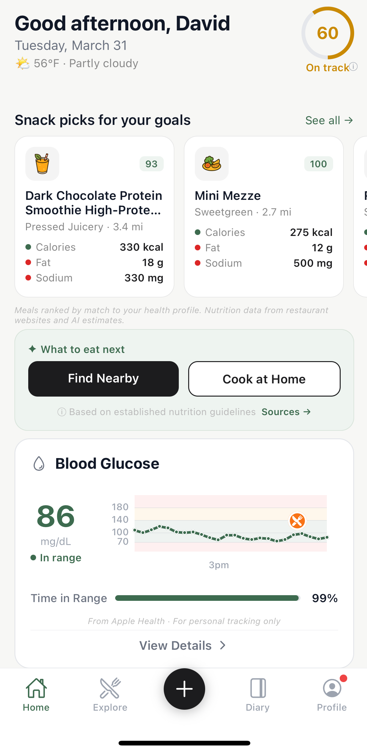 Connect Apple Health to see your blood glucose alongside your meals. NuMeal shows Time in Range, detects post-meal spikes, and helps you understand which foods affect your glucose — so you can make smarter choices next time.